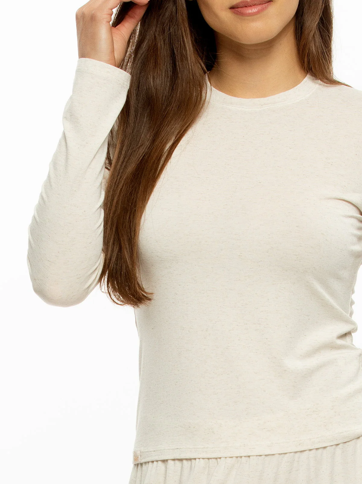 Our new Lena Sleepwear Collection features a Modal & Linen blend fabric that delivers a soft, buttery hand feel, while the linen adds texture and depth to the look of the collection. This two-piece pajama set includes a fitted, long-sleeve top paired with wide leg cropped pajama pants for an effortlessly cozy fit. The thoughtful combination of fit and flare keep the design simple yet refined. Designed for all-night comfort, this set is perfect for lounging, unwinding, and sleeping—so comfortable, you’ll look forward to putting it on every time.
