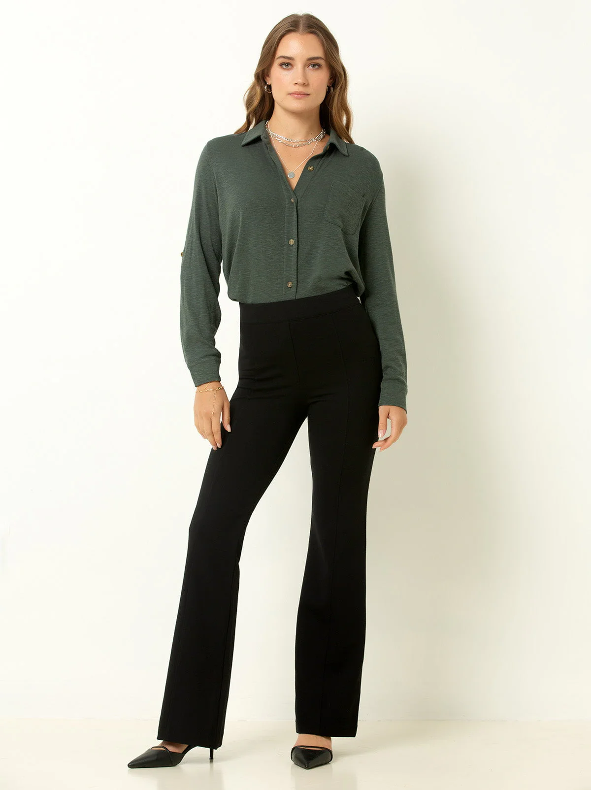 The Shaping High Rise Flare Pant features a supportive ponte knit fabric with gentle stretch for comfort and shape retention. Its high-rise waistband offers a secure fit and core control for a smooth silhouette. With a clean front and flare leg, it combines tailored style with everyday comfort.
